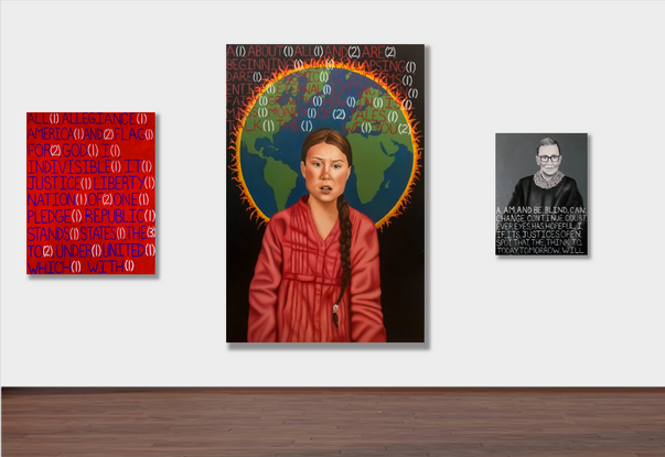 Having watched this country’s administration over the past few years, I’m shocked by their incompetence. I feel frustrated by their selfishness, astounded by their lies, and disheartened by their blatant sexism and racism. This series, America Bless God — By the Words, is an expression of those emotions and reactions, which many Americans have struggled with. Combining representational portraits and scrambled quotes allowed me to highlight truths, unfortunately branded as “fake news,” while emphasizing the absurd twists of language that have seemingly overtaken the president and those associated with him. With outrageous things happening every day it’s easy to lose track of the many, extremely significant, issues — global warming, presidential and administrative ineptitude, tiki-torch Nazis, rapist “civil servants,” inhuman treatment of people of color, and the mishandling of this pandemic. These events showcase a betrayal of the spirit of this country that is too important to allow to fade into memory. By addressing the absurdity it’s possible to grow and take actions toward a more positive future. With that goal in mind, 25 percent of the profits from this series will go to a cause related to the sold piece or print.